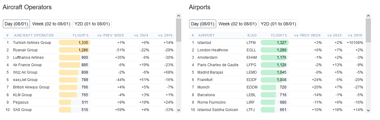 Türk Hava Yolları, 8 Ocak günü Avrupa’da en fazla uçak seferi gerçekleştiren havayolu olarak, Ryanair’i geride bıraktı. İstanbul Havalimanı da liderlik koltuğunda olmaya devam etti.